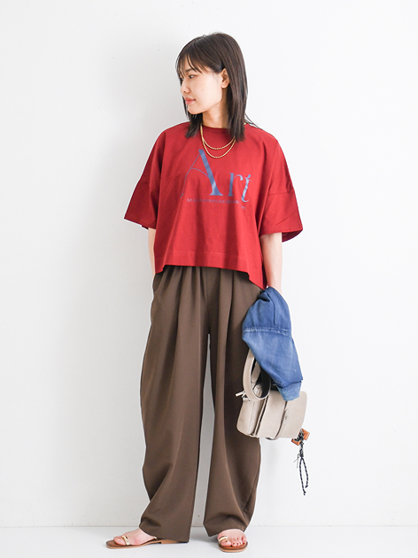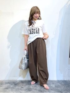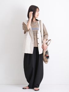 キャメルは、黒、ネイビー、グレーなどと相性が良く、カラー同士が馴染みつつ引き締め効果を期待することができます。こちらのようなカジュアルなTシャツコーディネートの時、ルーズに楽しむのも素敵ですがウエストインのブラウジングにするとスタイルアップさせることができます。パンツスタイルの時には、ウエスト位置を意識したコーディネートするだけで見た目の印象を変えることができますよ。