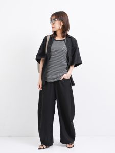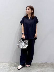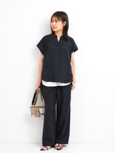 暑い季節は、Tシャツ素材のカジュアルテイストのアイテムが活躍してくれますね。こんな時、シルエットやシャツ素材など少しこだわるだけでカジュアルなコーディネートも落ち着いた雰囲気、エレガントに見せることができます。夏場は、トップスとボトムスの色味を揃えたり、セットアップアイテムを積極的に取り入れるのもおすすめ。セットアップアイテムは、手軽に綺麗めに見せることができますよ。