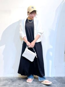 ブラックやネイビーカラーは、暑い季節には重たくなってしまいそうですがストライブのインナーなどを選ぶと大人カジュアルとしてもおすすめ。甘めなカラーやトレンドの素材を選んだ時も、ベーシックカラーのアイテムを選ぶことで大人っぽくトレンドのアイテムを楽しめます。季節感あるラフィア素材やサンダルなど、小物選びを工夫することでも理想のコーディネートに仕上げることができますよ。