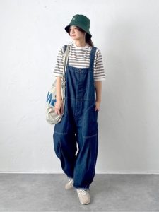 カジュアルなデニムサロペットにボーダートップスを合わせたスタイルに、バケットハットをプラスしてこなれ感を演出。