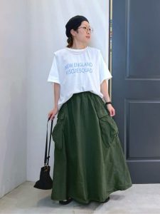 カーキのロングスカートは、シーズンムードを高めながらも体型をさりげなくカバーできる万能アイテムです。