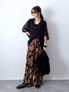 ワイドシルエットが体型をさりげなくカバーしながら、エレガントな印象を与えてくれます。