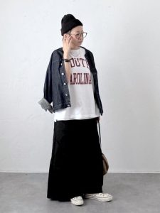 さらに、眼鏡や丸いバッグなどの小物を合わせれば、全体の印象が一気に垢抜けます。
