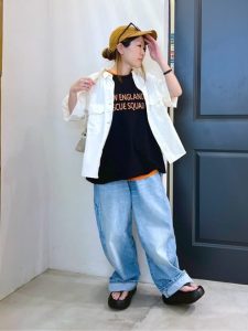 黒のロゴTシャツにホワイトのシャツを羽織ることで、シンプルながら抜け感のあるスタイルに仕上がります。