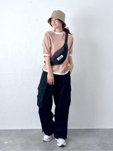 バケットハットや斜め掛けバッグをプラスすることで、シンプルなスタイルに今っぽさとこなれ感を演出。