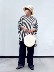 さらに白のハットとラウンドバッグで軽やかさをプラスすれば、季節の移り変わりを楽しむリラックスカジュアルが完成。