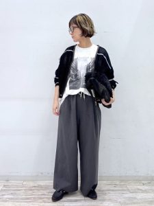 軽やかな印象のTシャツスタイルも、落ち着きあるチャコールグレーのワイドパンツを合わせることで大人っぽく仕上がります。