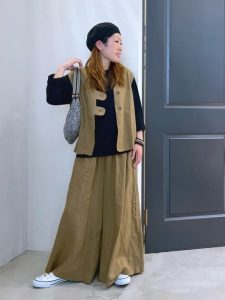 ワイドパンツやロングスカートを取り入れると体型カバーも叶い、動きやすさと上品さを両立。