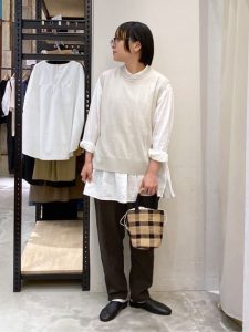 ロング丈の白シャツにベージュのニットベストを重ねることで、シンプルながらも奥行きのあるスタイルに仕上がります。