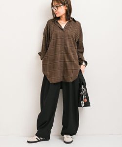 まだまだ暑い日が続いていますが季節を先取りしたい時、季節感を楽しむことができる柄アイテムを選んでみてはいかがでしょう。さまざまな柄がありますが、チェック柄はより秋らしさを楽しめますね。ダークカラーをベースにしているアイテムは、秋らしさを感じさせてくれるのではないでしょうか。ダークカラーは暑苦しいイメージですが、ボトムスのカラーを選ぶことで理想の雰囲気を楽しめます。