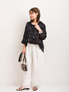秋らしい柄のひとつチェック柄は、カジュアルな雰囲気のアイテムです。カジュアルテイストのアイテムは、ベースカラーによってイメージが変わるのでアイテム選びが大切になります。オフホワイトやアイボリーといった白系のカラーを選ぶと、カジュアルテイストのチェック柄も女性らしくコーディネートすることができます。シンプルなデニムだけではなく、白色のパンツコーディネートも素敵ですよ。