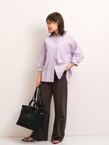 1-1.シンプルなデザインのシャツはライラックカラーを選んで女性らしくコーディネートする