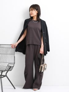 スッキリこなれ感あるシルエットを楽しめるパンツですが、スウェットライクなダブルジャージー素材の1枚です。コットンポリエステル素材なので、ほどよいカジュアル感と快適な履き心地なので幅広いスタイルに仕上げることができますよ。綺麗めシルエットなので、落ち着いた雰囲気を楽しめ大人世代にはコーディネートに選んで欲しいリラックスパンツ。落ち着いたブラウンが今年らしい雰囲気ですよね。