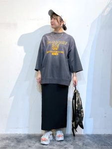 気温高めの日は、スポーツサンダルなどボリューム感ある足元に。涼しくなったら靴下合わせやスニーカーを選んでみてはいかがでしょう。スカートコーディネートは、エレガントなイメージがありますがカジュアルダウンすると今っぽい雰囲気を楽しめます。タイトシルエットのスカートは、着丈長めのトップスとも相性がよく気になるヒップやウエストラインもカバーできます。是非、取り入れてください。