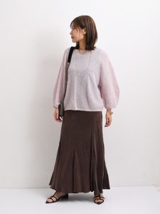 まだまだ暑い季節は、透け感のある素材を選ぶと風通りがよく快適に過ごすことができます。落ち着いたラベンダーカラーのトップスは、女性らしい雰囲気のコーディネートを楽しむことができる1枚としてもおすすめ。インナーの選び方によっては、さまざまなスタイルに仕上げることができるのではないでしょうか。ふんわりした袖などシンプルですが、フェミニンな雰囲気を楽しめるニットですね。