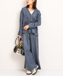 デニムカラーのセットアップアイテムは、手軽にコーディネートが完成するアイテム。こちらのセットアップは、シルクのような光沢感と柔らかな素材感が魅力です。デニム素材はカジュアルな雰囲気や、硬い素材感などが強く大人世代はカジュアルなコーディネートに限定してしまうことが多いのではないでしょうか。このような落ち感ある雰囲気を楽しめるアイテムを、選ぶことで楽しみやすくなりますね。