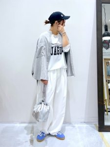 Vネックデザインを選ぶことで、まだまだ暑さが残る季節も快適に過ごすことができます。インナーの選び方とコーディネートによって、単品でもセットアップでも楽しめますよ。セットアップアイテムは、幅広い組合せを楽しめることから着回し力も高く万能なアイテムのひとつです。ゆるっと落ち感あるシルエットだからこそ、スニーカーを足元に選んでリラックス感ある雰囲気を楽しむのが素敵ですよ。