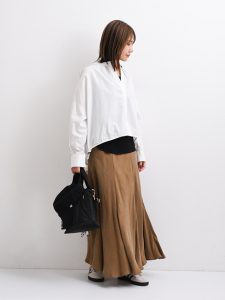 手軽にシルエットを変えることができるトップスは、パンツ、スカートなど幅広くコーディネートすることができる万能アイテム。季節の変わり目は、軽やかなシャツがワードローブにあるだけでコーディネートの悩みを解決してくれますね。シャツスタイルは綺麗になりすぎてしまうこともありますが、スニーカーを足元に選ぶとカジュアルダウンにつながります。上手に取り入れバランスよく楽しみましょう。