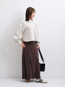 スウェットは、着心地がよく季節の変わり目に使いやすいのですがカジュアルになりすぎてしまうのが難点。マーメイドスカートなど少し綺麗めなアイテムを選ぶことで、大人っぽくエレガントな雰囲気をプラスすると良いでしょう。ただし、スカートによってはエレガントすぎてしまうため足元にスニーカーを選ぶのがおすすめ。スニーカーを選ぶことで、トレンド感ある今っぽい雰囲気が楽しめますよ。