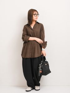 パンツ、スニーカーのコーディネートは、アクティブに過ごすことができますが大人世代にとってはカジュアルに見えすぎてしまうのが悩み。こんな時は、アイテムのカラー選びを工夫すると良いでしょう。これから秋に向けておすすめなのが、ブラウンとブラックの組合せ。このカラーコーディネートは、とっても相性がよく、落ち着いた雰囲気と季節感ある雰囲気を手軽に楽しむことができますよ。