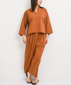 コットン、ポリウレタン素材なので、自宅で手軽にお手入れできるのはポイントが高いですね。暑さが残る秋のはじめには、取扱いが簡単なアイテムが重宝するでしょう。テラコッタのようなキャメルカラーは、手軽に秋らしさを楽しむことができるアイテムです。シンプルで快適に過ごすことができるアイテムは、上手なカラー選びと、アイテムによって季節感あるコーディネートに仕上げて楽しめますよ。