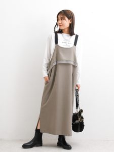 つなぎのひとつサロペットは、手軽にコーディネートを完成させることができるアイテムです。また、ウエストなどの締め付け感がないため快適な着心地も魅力のひとつ。サロペットやキャミソールワンピースは、コーディネートの悩みが少なくなるほかにも、風通りがよく暑い季節も快適に過ごすことができますよね。インナーを半袖から長袖に変えるだけで、天候にピッタリのコーディネートを楽しめます。