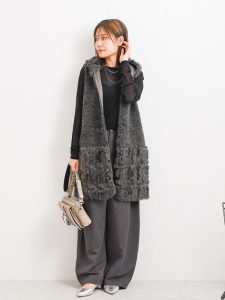 裏表の両方で楽しむことができるファーフーディは、エレガントなカジュアル感を楽しむことができる1枚。フードデザインが今っぽさを感じさせてくれるベストではないでしょうか。着丈が長めなので、ヒップや脚のラインを上手にカバーしてくれるところもポイントが高いですよね。シンプルなデザインなので、パンツスタイルはもちろんスカートやワンピースとコーディネートしても素敵ですよね。