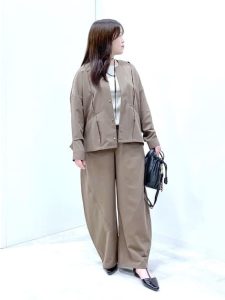 ボトムスは、定番のテーパードなどではなくモロッコパンツなので気になるウエスト、ヒップ、脚のラインをカバーしてくれるところも嬉しいですね。ブラウンとチャコールという茶系カラーなので、女性らしく優しい雰囲気を楽しめますよ。セットアップコーデはもちろん、シンプルに単品で活躍してくれるため活躍頻度も高いのではないでしょうか。ワードローブに用意しておくと便利なアイテムですよ。