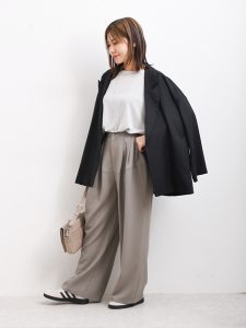ボトムスには、3タックで立体感のあるシルエットが魅力のパンツを選んでいます。落ち感があるため、カジュアルテイストのコーディネートでも上品に見せてくれる大人世代には欠かせない1枚です。落ち感あるシンプルなボトムスは、手軽にトレンドコーデを楽しむことができるパンツですよ。こちらのパンツには、同素材のトップスが用意されているためセットアップでコーディネートすることができます。