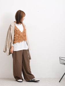 襟付きのシャツをインナーに選ぶことで、コーディネート全体を引き締めてくれ上品な雰囲気に仕上げることができます。ボトムスには、ツータックセミワイドパンツを選んでいます。定番カラーとほどよいゆったり感を楽しめるボトムスなので、カジュアルから綺麗めまで活躍します。カジュアルなアイテムも、アイテムのカラー選び、コーディネート次第で理想のスタイルを楽しめるのではないでしょうか。
