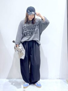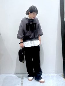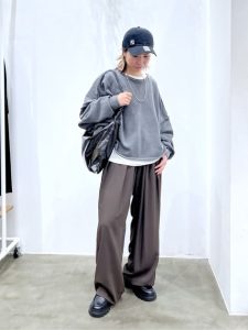 着心地がよく快適なスウェットですが、カジュアル感が強くなってしまうためコーディネートする時には注意が必要です。定番のスウェットとデニム合わせはメンズライクになったり、カジュアル感が強すぎてしまいますね。こちらのように、タックパンツなど綺麗めなボトムスを選ぶと良いでしょう。タックパンツやテーパードは、スタイルアップ効果を期待でき上品な雰囲気を楽しめるアイテムですよ。