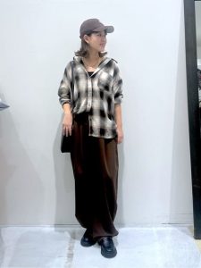 チェック柄は、秋らしさを楽しめる柄のひとつです。季節によって、さまざまな柄アイテムが登場しますね。手軽にコーディネートに季節感をプラスしたい時、柄アイテムを選ぶのも上手な方法です。ただし、カラーや柄によってはカジュアル感が強くなってしまうためバランスよく組み合わせてください。こちらは、秋らしいダークカラーのボトムスとコーディネートして落ち着いた雰囲気に仕上げています。