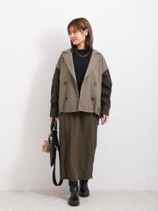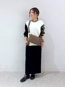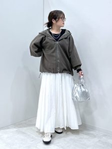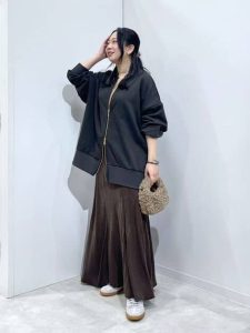 パンツ派、スカート派とコーディネートには好みがありますね。どちらのスタイルも、メリット、デメリットがありますがスカートコーディネートは比較的、落ち着いた雰囲気に仕上げやすいのではないでしょうか。季節の変わり目は、スウェットやスニーカーなどカジュアルなアイテムが活躍します。こんな時、ボトムスにスカートを選ぶことで大人っぽさと、女性らしい雰囲気を楽しむことができます。