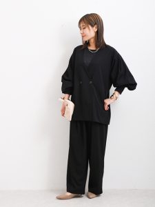 セットアップアイテムを選ぶ時、サイズ感によってコーディネートの幅が広がりますよ。ゆったりとしたオーバーシルエットのアイテムは、インナーや足元、小物の選び方次第でカジュアルにも綺麗めにも仕上げることができます。こちらのようなブラックカラーのアイテムは、着回し力が高くワードローブにあると活躍度が高いアイテムとしてもおすすめ。セットアップは、時短アイテムでも活躍しますね。