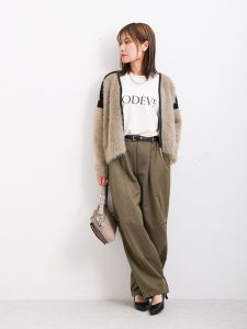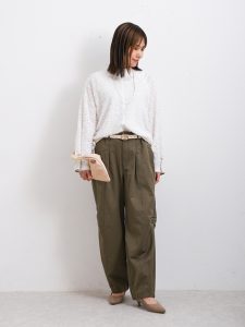 シンプルなロングスカートとコーディネートしても女性らしくて、素敵なのではないでしょうか。今回は、タックワイドパンツとのコーディネート。しっかりと生地のボリュームを楽しむことができるパンツですが、落ち感があるため上品な雰囲気に仕上げることができます。全体をベージュやオフホワイトといった優しいカラーでまとめることで、重すぎず軽やかに見せることができます。カラー選びが大切。