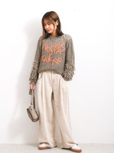 シンプルなタックワイドパンツは、気になるウエストやヒップ、脚のラインをカバーしてくれるお助けアイテム。年齢を重ねると、スタイルのさまざまな部分が気になり悩みがつきないのではないでしょうか。こんな時は、ゆったりシルエットのパンツを選ぶことでカバーできます。フリンジと胸元のロゴデザインが個性的なニットは、コーディネートの主役となるアイテムとしてもおすすめですよ。