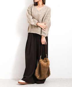 2-3.シンプルニット×パンツに旬なファートートをプラスする今年らしいデイリースタイル