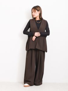 フロントボタンを開閉することで、幅広い着こなしを楽しむことができるのも魅力です。今回はセットアップ使いにすることで、より落ち着いた雰囲気に仕上がっているのではないでしょうか。ブラウン、ブラックの組合せにすることで、柔らかな大人っぽい雰囲気に近づくことができます。すっきりとシンプルですが、ほどよくエレガントで40、50代の女性におすすめしたいコーディネートのひとつです。