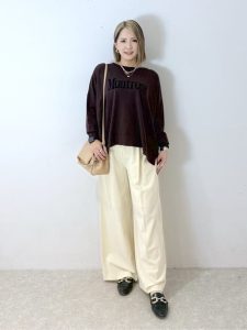 ボトムスは、気になるウエストやヒップラインをカバーしてくれるカーブパンツ。カジュアルなカーブパンツですが、綺麗めな素材感なのでオンオフ問わず使えて簡単に今っぽいコーディネートを完成することができます。同素材のジャケットがあるため、セットアップで用意をしておくと幅広いコーディネートに対応してくれますよ。インナー、カラー選びを工夫しながら、小物を厳選して着回してください。