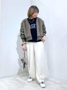 ナイロンやフェイクレザーをドッキングした異素材ミックスブルゾンは、カジュアルと大人っぽさをMIXした絶妙な雰囲気が特徴の1枚です。リッチな質感のフェイクファー素材が、ストリート感あるMA-1風ブルゾンを柔らかく見せてくれています。MA1のようなカジュアル感強めのアイテムは、大人世代がコーディネートに取り入れる時は組合せ方やカラー選びがとても大切になるので注意が必要です。