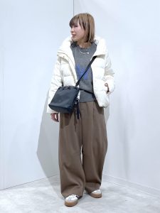 ボリュームアウターを選んだ時、全体のバランスによってイメージを変えることができます。こちらのようなゆるっとパンツを選ぶことで、落ち感を楽しめるコーディネートが完成します。ゆるっとしたシルエットは、落ち感を楽しめるだけではなく、細見え効果を期待できるため積極的に取り入れてください。ヒップやウエスト、脚のラインなど、気になる部分も上手にカバーしてくれるのでおすすめです。