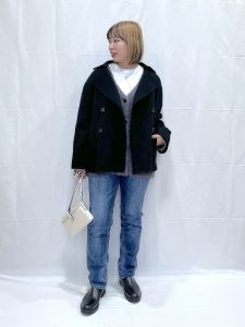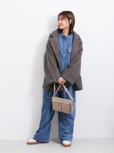こちらのボアコートは、袖部分がボア素材になっているためオールブラックでも質感の違いを楽しむことができます。ウエストや裾部分を紐で絞ることができるため、手軽に好みのシルエットに仕上げることができるでしょう。軽やかに見せたい時は、こちらのように明るめカラーのボトムスやバッグを選ぶことで、バランスよくなりますよ。メリハリのあるカラー使い、ボリュームでスッキリ見えますね。