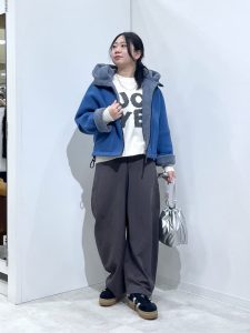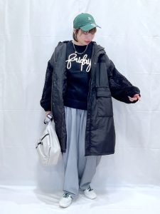2-2.ボリュームアウターとゆるパンツの組合せで完成させる細見えコーディネート