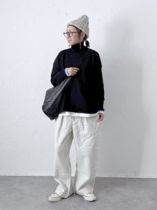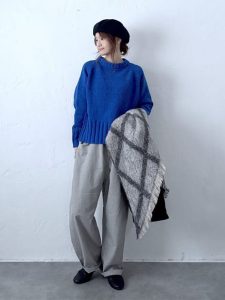 程よくゆとりのあるニットに、落ち感のあるパンツを合わせることで、リラックス感がありながらも上品な印象に仕上がります。
