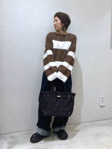 ボーダーニットの配色がほどよいアクセントとなり、シンプルながらも表情のある着こなしに。