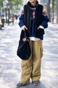 存在感のある柄ニットも、カーゴパンツを合わせることで甘さを抑えた大人のニットカジュアルに仕上がります。