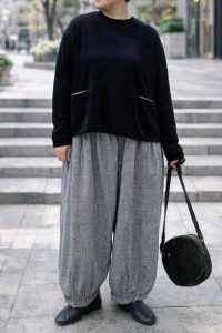 ゆったりパンツを合わせても重たく見えないのは、トップスにメリハリがあるから。