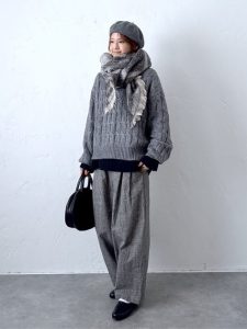 ニット・パンツ・ストールを同系色でまとめたワントーンコーデは、統一感が生まれ、自然と洗練された雰囲気に。