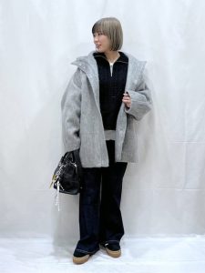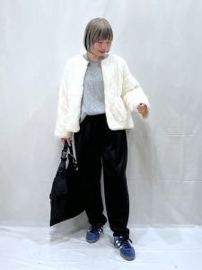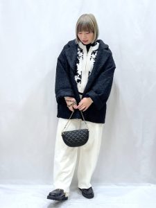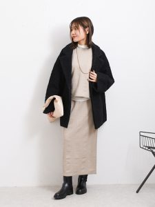 ベージュやオフホワイトなどの明るいカラーは、顔映りをよく見せてくれる効果も期待できます。手軽に女性らしい雰囲気に仕上げることができるカラーです。ただし、明るいカラーはアイテムによっては膨張してしまう可能性があるため引き締めてくれるカラー、小物を上手にプラスするのがポイント。今回は、ブラックカラーのミドルコートを羽織ることで落ち着いた雰囲気とスッキリ感を加えてくれますね。