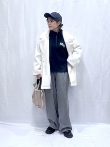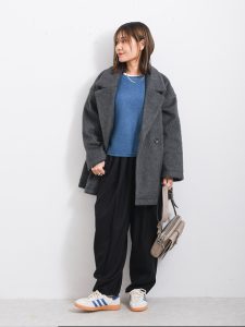 グレーのアウターは、暗いイメージが強いですがインナーやボトムス、巻物など小物使いによって印象を変えることができるので是非試してください。色合わせをしやすいグレーは、意外とカラーコーディネートがしやすく悩むことなくコーディネートを楽しめるのではないでしょうか。ボトムスには、コクーンギャザーパンツを選んでいます。立体的なデザインで、バランスよく仕上げることができますよ。